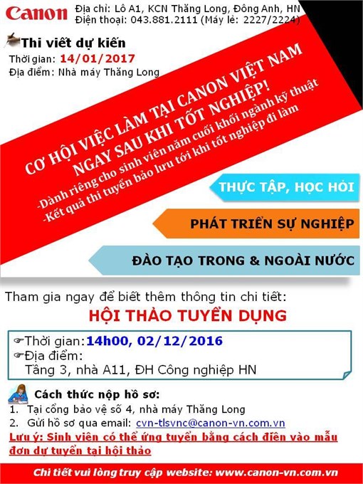 Trường ĐH Công nghiệp Hà Nội phối hợp với Công ty TNHH Canon Việt Nam (Canon Thăng Long) tổ chức Hội thảo cơ hội việc làm của Công ty cụ thể:- Thời gian: 13:45, thứ 6 ngày 02/12/2016- Địa điểm: Hội trường tầng 3 nhà A11